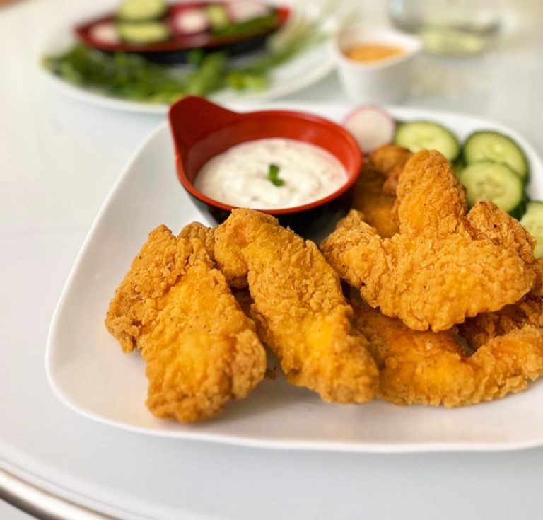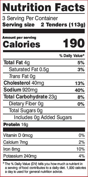 Ingredients: Chicken Breast Tenders Containing up to 15% Solution of Water, Starch, Salt and Sodium Phosphates, Breaded with: Bleached Wheat Flour, Salt, Soybean Oil (as a processing aid), Spice, Leavening (Sodium Aluminum Phosphate, Sodium Bicarbonate), Garlic Powder, Extractives of Paprika, Spice Extractives. Predusted and Battered with: Water, Bleached Wheat Flour, Modified Corn Starch, Yellow Corn Flour, Salt, Egg Whites, Leavening (Sodium Acid Pyrophosphate, Sodium Bicarbonate), Soybean Oil, Onion Powder, Methylcellulose, Extractives of Paprika, Extractives of Turmeric, Extractives of Celery Seed. Breading Set in Soybean Oil.